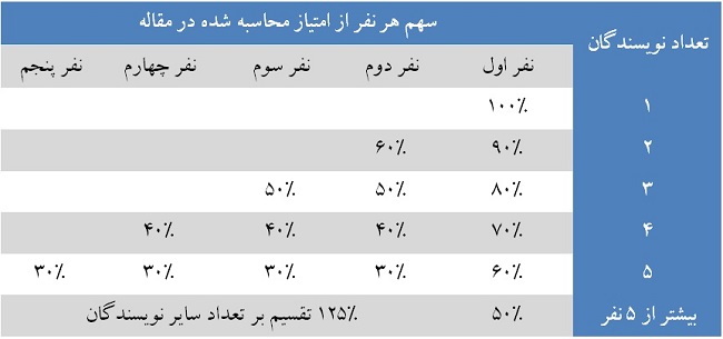 به طور معمول نفر اول هر پژوهش امتیاز کامل از مقاله میبرد. البته با اضافه شدن نام هر نویسنده جدید، بخشی از نمره نفر اول کاهش مییابد. همچنین باید توجه شود که امتیاز نفر اول و نویسنده مسئول مقاله یکی نمیباشد. نفر اول معمولاً بالاترین جایگاه را در بین نویسندگان یک مقاله دارد و نویسنده مسئول صرفاً به عنوان مسئول مکاتبات در نظر گرفته میشود. در لینک زیر میتوانید جدولی را مشاهده نمایید که امتیاز نویسندگان مقاله بر حسب ترتیب اسامی را شرح میدهد.